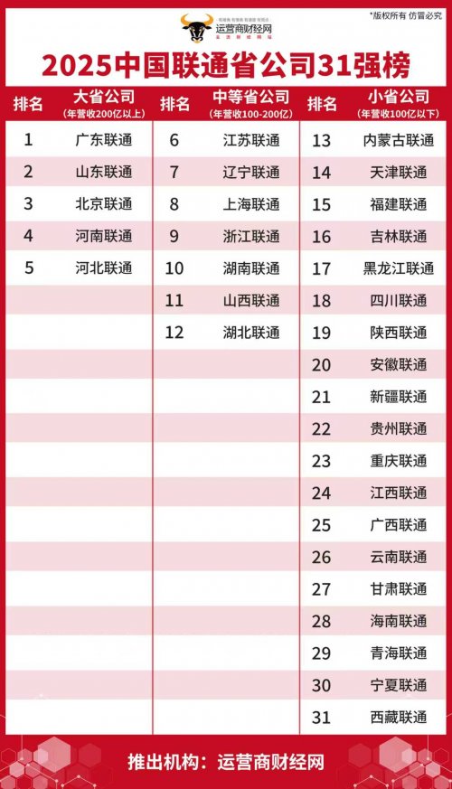 近期,运营商财经网独家编制的“2025中国联通省公司31强榜”名单正式公布镕盛融资,每一家省公司都依照客观的经营数据进行了排名,结果令人意想不到。
