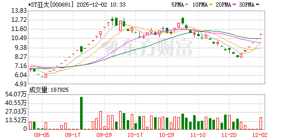*ST亚太盘中涨停,已连收6个涨停板,截至9:32,该股报10.96元,换手率0.18%,成交量57.27万股,成交金额627.68万元,涨停板封单金额为1.28亿元。连续涨停期间,该股累计上涨33.99%,累计换手率为6.54%。最新A股总市值达35.43亿元。